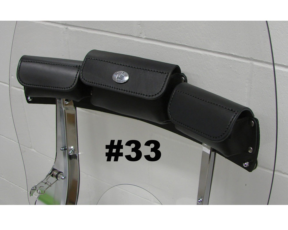 Leather pockets, velcro closure. Leather lined plastic back attaches to bolts on center bars.