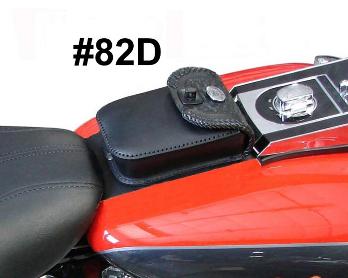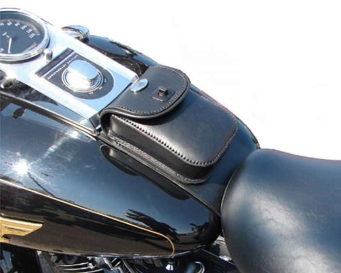 Tank bags for single tank softails. Pouch size is 5″ wide 6 1/2″ tall and 1 3/4″ thick, padded back.