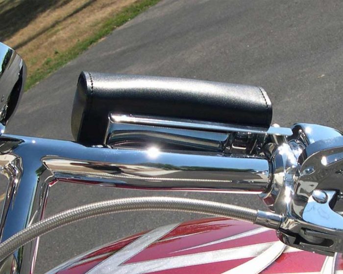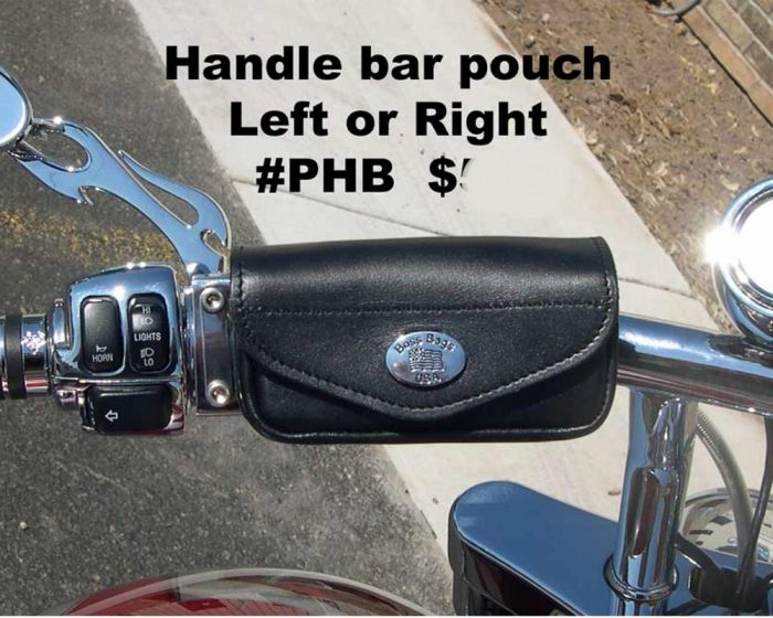 Plain Leather handle bar pouch has attractive polished stainless steel mount. Attaches using the 2 screw mounts for controls. Velcro closure on the lid. Great for chap stick, sunglasses, etc. 6″ wide, 3 ” tall, 2″ thick. Fits left or right.